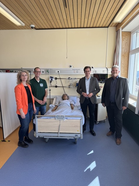 Ein besonderes Highlight des Besuchs war die Vorstellung des hochmodernen Simulationslabors, des "Sim-Labs". Dieses Labor ist das Alleinstellungsmerkmal der Akademie im Umkreis von 100 Kilometern. Hier können die Auszubildenden an fast lebensechten Simulatoren üben. Ob Reanimation oder die Überwachung kritischer Patientenzustände, die angehenden Pflegekräfte können hier unter der Beobachtung ihrer Lehrkräfte selbstständig agieren und wertvolle praktische Erfahrungen sammeln. "Besonders wertvoll ist die Selbstreflexion danach, welche aufgrund der Kameraaufzeichnung möglich ist", betonte Gießübl. Er fügte hinzu, dass Auszubildende auf diese Weise 90% ihrer Fehler erkennen und diese so später kaum noch wiederholen. Das 2016 eingeführte und von den Mitarbeitern Sven Büchler und Sebastian Weber stetig weiterentwickelte "Sim-Lab" sei die Zukunft der Pflegeausbildung, ein Bereich, in dem Deutschland noch Aufholbedarf habe.